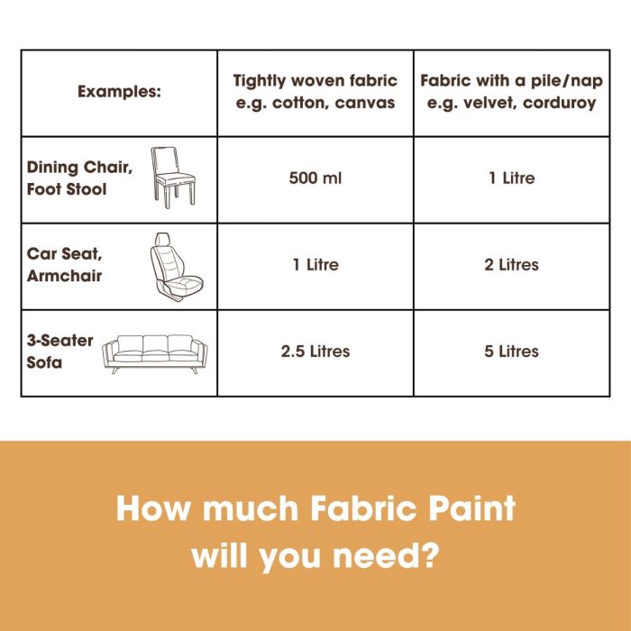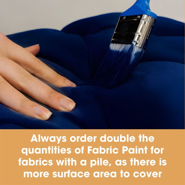 Si la tela tiene pelo, como el terciopelo, la imitación de ante, la chenilla, el draylon o la microfibra, necesitarás más producto. Esto se debe a que hay mucha más superficie que cubrir en este tipo de tejidos. Recomendamos pedir el doble de las cantidades de pintura para tela indicadas anteriormente para estos tipos de tejidos. También recomendamos cepillar la tela a intervalos regulares durante el tiempo de secado para asegurarse de que no se endurezca.